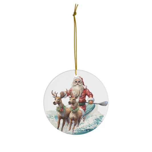 Santa on SUP Board with Reindeer Christmas Ceramic Ornament